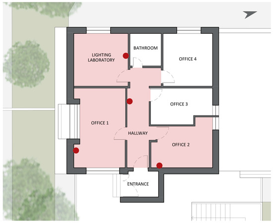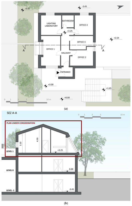 The floor consists of an entrance hall, four offices, a lighting laboratory, a hallway, and a bathroom (Figure 4a). The internal height of the floor is between 3.10 and 4.50 m (Figure 4b).