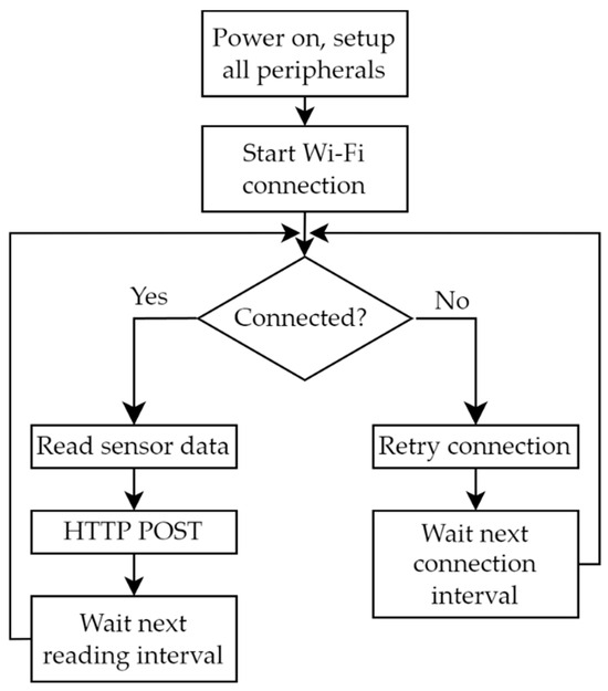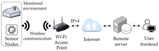 The electronic components used for the implementation of the WSN nodes in this study have been chosen following two main criteria. The Espressif ESP series microcontrollers are well documented by the productor both in terms of hardware and firmware development [60]. The configuration of the nodes is made easier using wireless interfaces that can be integrated using open-source documentation [61], allowing for the reduction of the overall complexity of the deployment of a research-grade system. The availability of the mentioned circuits in the market is the one motivation, as the selected node elements are widespread in the free market at competitive prices. The use of a Wi-Fi connection enables the portability of the sensor system to different locations, as the only gateway needed to access the internet is a Wi-Fi access point with a 2.4 GHz band.