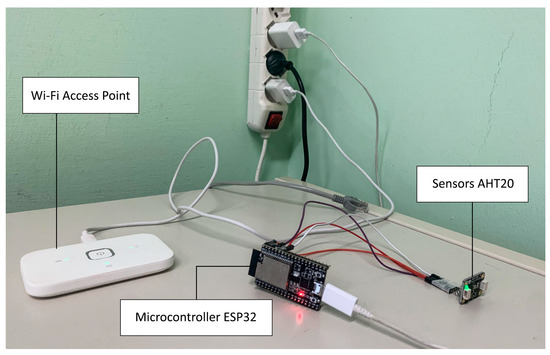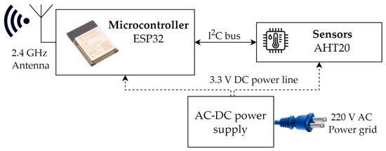 The sensor nodes are structured as shown in Figure 7. A core ESP32 microcontroller [58], by Espressif, periodically retrieves information from the sensors, which are of the type AHT20 [59], from Asair. Data are encapsulated in JSON format and transmitted using POST requests. If the request is not successful, it is repeated after a guard time period. If the network connectivity is not available, the sensor nodes enter a sleep mode and the connection attempts loop.