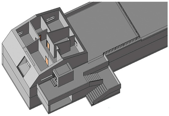 The BIM model of the building was created with Autodesk Revit 2023 on the basis of available two-dimensional executive technical drawings and integrated with infrared thermography analysis. Revit was chosen due to its versatility in modeling various types of buildings and its adaptability to a wide range of studies [64]. Additionally, Revit offers a high level of interoperability compared to many other BIMs, providing greater flexibility when integrating with other software and other technologies for data exchange. The general overview of the model is presented in Figure 10.