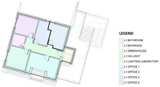 The building, dating back to the 1970s, is made of reinforced concrete. The name “Solar House” derives from the particular shape of the roof, designed to accommodate solar and photovoltaic panels which; however, are not currently present. The building consists of three floors, one basement, and two above grounds. Only the first floor, i.e., the floor containing the offices of the Las.E.R Laboratory (Laser and Electro-optical Research in engineering metrology) research group, was taken into consideration for the experimentation (Figure 3).