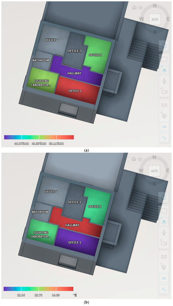Although digital twin technology has gained attention for indoor environment monitoring, its use in the industry remains limited due to unresolved challenges that prevent large-scale implementation. However, DT could play a crucial role in improving the communication and the processing of data deriving from sensors, offering several benefits in the energy field. First, the system’s user-friendly design would improve interaction between the building, system, and user, supporting the increase in awareness of the user himself, who is mainly responsible for the correct management of living spaces. Involving end users in monitoring could stimulate them to improve their habits in terms of energy consumption [43]. Furthermore, the approach would bring significant benefits in the implementation of energy interventions, whether immediate or planned. Through the DT, in fact, the facility managers can constantly and simultaneously monitor the data coming from the various sensors placed in the building, instantly identifying the presence of anomalies and their exact spatial location, even remotely. This promotes proactive maintenance, allowing immediate interventions if necessary [44]. Moreover, the potential integration of the DT with automatic control systems would help to keep the measured environmental parameters within the imposed threshold values. On the other hand, in the context of the planned interventions, the historical data gathered during the monitoring period can be used to calibrate the building’s thermal model, providing accurate and reliable energy analyses that can serve as the foundation for any energy optimization projects. Finally, in addition to the various advantages mentioned above, it should be highlighted that in the case of very long monitoring, which involves a large number of environments, the instantaneous and automatic processing of data, provided by the integrated BIM and DT platform, would help limit human errors related to data interpretation.