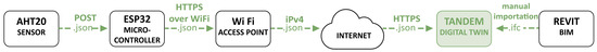 The block scheme of the monitoring system employed in this work is shown in Figure 6. The sensor nodes are equipped with wireless communication using Wi-Fi. These elements are powered directly from the electrical grid by means of a Direct Current (DC) power supply. In this case, there is no need for batteries as the grid supply is always available. The same principles apply to scenarios where energy harvesting can be exploited in remote or non-electrically served environments [57]. The Wi-Fi network access for internet connection is the same one used for normal operation in the offices. Using HTTPS requests, the nodes forward the sensor measurements to the Tandem platform that acts as a database. Then, the information can be accessed using the user front end.