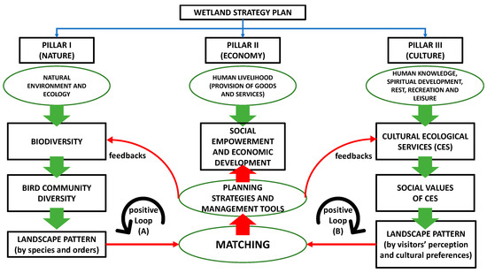 Methodological planning of the research work. The flow chart was designed by the authors to show the relationships between the three pillars considered in a wetland strategic plan: nature, economy, and culture. Each green arrow indicates the path being studied and the red arrows indicate the links and relationships between them. Two positive loops are generated by matching the ecological analysis with the socio-cultural analysis: feedback (A) a better strategy for ecological conservation and feedback (B) a better strategy for the provision of cultural services.