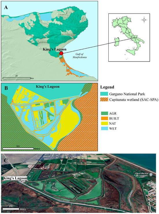Satellite image and planimetric map of King’s Lagoon, the coastal wetland considered in the study case. (A) Location of the study area within the Gargano National Park (southern Italy). (B) Planimetric map displaying the following landcover classes: AGR (agricultural areas); BUILT (built-up areas); NAT (semi-natural vegetation areas and meadows); and WET (wetlands and aquatic/riparian ecosystems). (C) Satellite image of King’s Lagoon.