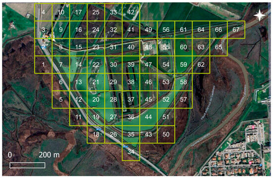 The orthophoto of the study area was overlaid with a square grid of a 100 m mesh, covering the entire surface of the wetland and some surrounding areas, which are considered important for bird presence (Figure 3).