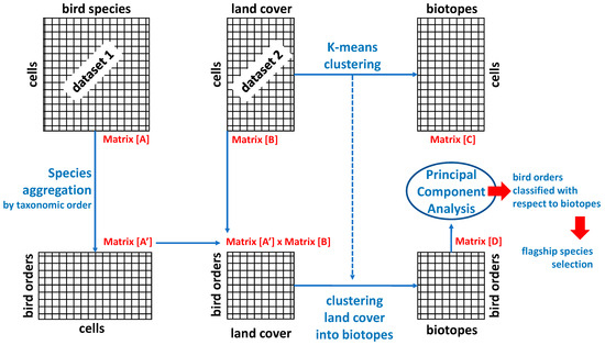 Therefore, Matrix [A] was converted and also transposed to obtain Matrix [A’], with bird orders in rows and wetland cells in columns (Figure 4). With respect to Matrix [B], a cluster analysis using the K-means procedure was performed, which identified some representative biotope categories that characterize the wetland on the basis of the land cover partitioning of each cell. The biotope categories thus include, at least partially, the habitats of the bird species observed during the annual survey. In this way, Matrix [C] was obtained (Figure 4) and the biotope categories were described according to their average relative land cover (biotope centroid) and their variability (cluster dispersion). Multiplying Matrix [A’] by Matrix [B] gives a new matrix with the taxonomic orders of the birds in the rows and the land cover in the columns. This matrix is only temporary because the classification rules from the previous cluster analysis (K-means clustering) are applied to it, transforming the land cover fractions into biotope categories. The result is Matrix [D] (Figure 4), which is a distance/proximity matrix of each bird order to each biotope centroid. By taking the inverse of each matrix element and normalizing the elements, this matrix can be transformed into a “membership” matrix that indicates the degree of association of each bird order with a corresponding biotope. Finally, a Principal Component Analysis (PCA) can be performed to verify the association between the taxonomic orders of species and their predominant reference biotope (Figure 4). Having obtained a clear picture of the distribution of the ornithological community within the wetland biotopes, it is then possible to make an informed choice of which bird species (a single species or a group of species within an order) should best play the role of flagship species, being abundant, widespread, charismatic, and well-known, and thus more likely to attract public interest and raise awareness of wider conservation issues.