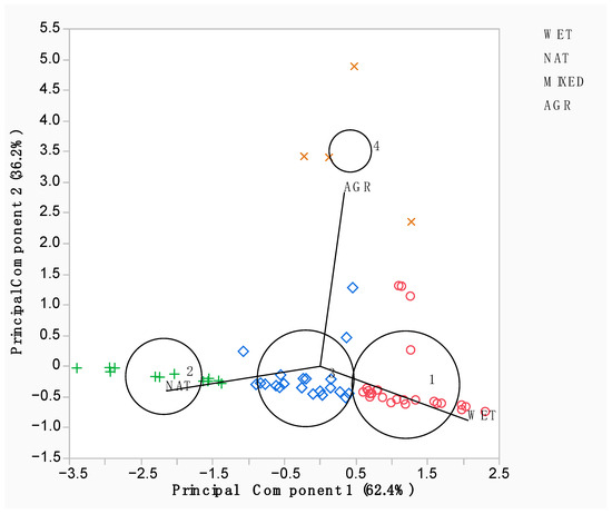 Clustering (circle) of the four wetland biotope categories and display of the wetland cells (dots) according to a principal component plot. The shaded colored area of each cluster encloses the 50% of the observations, while the size of each black line circle is proportional to the count of the observations. Different colors specify the four identified clusters corresponding to the biotope categories: 1. WET (26 cells); 2. NAT (13 cells); 3. MIXED (21 cells), and 4. AGR (4 cells).