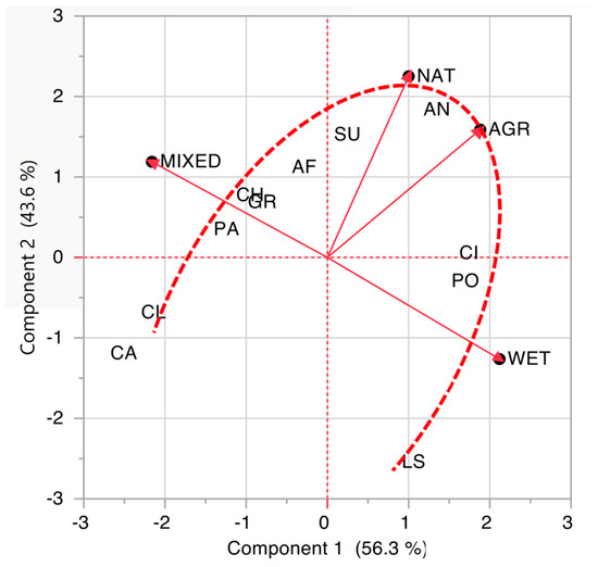 In contrast, the vectors associated to the NAT and AGR biotopes are oriented toward the upper right of the graph, are highly correlated with each other, and are only slightly angularly offset from each other. Therefore, it can be clearly observed that the CA and CL bird taxonomic orders (Caprimulgiformes–Apodiformes and Columbiformes) are highly associated with the MIXED biotope and the membership values of the MIXED biotope decrease along an elliptical path while the membership values of the WET biotope progressively increase to reach the bird taxonomic orders of LS (Laridae and Sternidae), where the highest membership values of the WET biotope are observed. The generally very low membership values associated with the NAT and AGR biotope categories along this elliptical path first increase (starting with CA and CL) and then decrease (ending with LS), reaching the maximum membership value for the AN bird taxonomic order (Anseriformes), placed at the vertex of the ellipse. Table 4 shows the membership values just commented on in Figure 6.