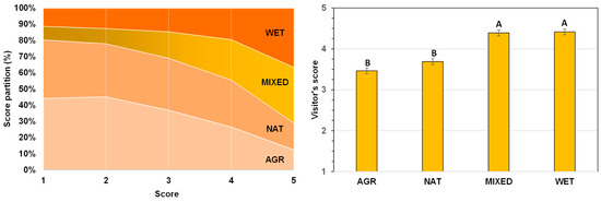 (A) Trends in the scores (from 1 to 5) given by visitors to the four selected biotope categories (AGR, NAT, MIXED, and WET) and (B) corresponding average score. Levels not connected with the same letter are significantly different (p < 0.05).