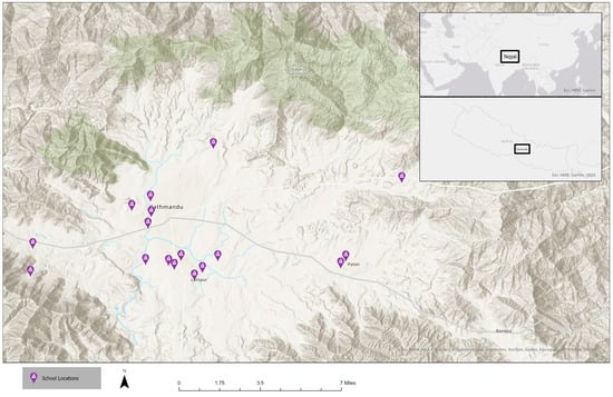 Nepal’s unique geographical setting is characterized by steep slopes, tectonically evolving Himalayan ranges, heavy monsoon rainfall patterns, and a diverse spectrum of geological and hydro-meteorological hazards, which presents a complex set of challenges. These hazards, ranging from landslides and debris flows to floods and glacial lake outbursts, along with the threat of earthquakes, fires, drought, and epidemics, underscore the multifaceted challenges faced by the country [1,2,3]. Recent studies indicate a concerning increase in the frequency of natural disasters. During 2011–2023, 248 earthquakes occurred in Nepal, which caused the deaths of 9131 people [4]. In the same period, Nepal experienced 23,767 fires and 3279 incidents of landslides. These caused the deaths of 3393 people, which consequently affected 44,138 families [4]. This high casualty rate is often attributed to uncontrolled development, environmental degradation, climate change, and human interventions [1,2,5]. The majority of disaster-induced deaths and sufferings occurred among infants, school children, seniors, and other socially vulnerable groups.
