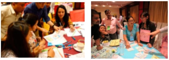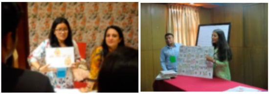 After finalizing the themes, each group identified local games played by the students and was tasked with integrating the disaster theme into the selected game. The first group of teachers from Kathmandu chose the storytelling method. The Lalitpur teachers decided to work on a Relay Race for Earthquake Awareness. The teachers from the other three municipalities selected the Snakes and Ladders game. The groups’ efforts to streamline existing games with themes of the selected disaster continued for two days. During the first half of the first day, they explored the principles of game design. In the second half, they started discussing, brainstorming ideas, and streamlining games (Figure 3). On the second day, they fully engaged in developing their versions of the games while receiving rigorous feedback from the game design expert. In the first half of the third day, they completed the draft of the games and prepared presentations.