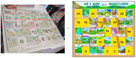 An analog (left) and digital (right) prototype of the Snakes and Ladders Game for Landslides Awareness Building (The text is written in Nepali language, where various disaster preparedness activities are shown through snake and ladder, and the name of the game is written in the local language, i.e., in Nepali on the top left and written on English in Top right of the game).