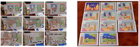 The environment of the Picture Story Game for Fire Safety is represented by a set of A3-sized cards containing ten different pictures (Figure 7). Each card depicts different stages of a story related to fire safety. It can be played indoors or outdoors. An indoor environment, such as a classroom, allows for structured discussion, while an outdoor setting can provide a dynamic and engaging experience for larger groups.