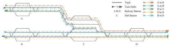 Figure 1 illustrates the network location of the hub station and the train path diagram. As depicted, Station C serves as a junction connecting two lines and handles trains from three different directions. These trains follow various paths, intersecting within Station C. This convergence of different train types leads to operational conflicts and some degree of interference at the station.