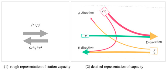 Therefore, this study posits that the number of trains from each direction is a component of a hub station’s capacity. To depict this capacity more accurately, a combined representation is proposed. This approach integrates the overall station capacity value into the number of different route trains, alongside a corresponding station saturation operation plan. Contrary to using a single value to approximate overall capacity, this method more effectively captures the composition of cross-line trains in a hub station, as illustrated in Figure 2 and Table 1.