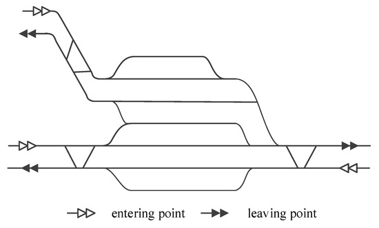 Figure 3 presents the layout of a railway station, illustrating how trains enter or exit at specific station boundaries. These points are identified as station entering points and leaving points. Directly linked to railway sections, they connect various line destinations within the station. Typically, a station entering point cannot function as a leaving point, or vice versa [16].