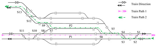 In the station, the area between the entering point and the track is known as the throat area. This area, connecting the section with the platform tracks, is often where operational interference is most severe. Trains enter the station from the entering point, traveling via the inbound route to reach the platform track, with a similar process for exiting the station. Both inbound and outbound routes comprise a series of sections and switches along the way. These inbound and outbound routes represent predefined operation processes for trains during their arrival and departure. All these routes pass through the throat area of the station, with some routes sharing sections and switches. Therefore, the station operation plan must ensure that all train routes in the throat area are arranged without any interference or conflicts.