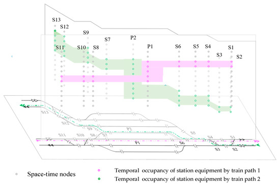 Trains moving within a station traverse sections, switches, and platform tracks. Once station equipment is occupied by a train route, it cannot be simultaneously used by another conflicting route. The train’s movements sequentially occupy and release station equipment, utilizing both time and space resources.