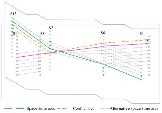 Station equipment cannot be occupied by more than one train at the same time, to avoid operational conflicts. Consequently, conflicting space–time arcs in the station’s space–time network cannot be selected simultaneously. This operational conflict is detailed in Equation (4).