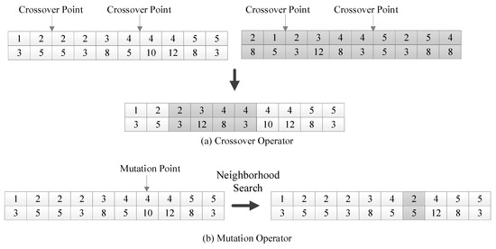 As illustrated in Figure 8a, chromosome crossover is performed via two-point crossover. For two individuals chosen from the parent generation, two random points on gene fragment 1 are selected. The parent chromosome segment between these points and the corresponding segment, 2, is extracted. They are then duplicated and swapped to form a new offspring chromosome.
