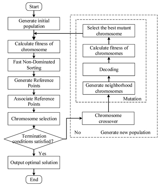 To this end, Deb and Jain [54] improved on the NSGA-II framework to obtain the NSGA-III (Non-Dominated Sorting Genetic Algorithm III) algorithm. The NSGA-II algorithm is a fast non-dominated multi-objective optimization algorithm with an elite retention strategy and a multi-objective evolutionary algorithm based on Pareto domination. Based on the NSGA-II algorithm, Deb retains some individuals in the population that are non-dominated but close to the reference point by introducing the reference point mechanism, avoiding the problem of low search efficiency caused by the large proportion of non-dominated solutions in the population when the number of optimization objectives is large. Thus, NSGA-III has good applicability to multi-objective optimization problems with four or more objective functions.