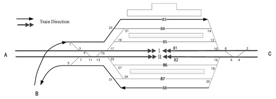 The station passing capacity model based on space–time path selection maximizes the number of trains passing through the station within a given time frame, which can be expressed as Equation (1).