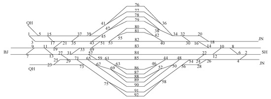 Figure 1 shows that the total number of trains passing through the station per unit of time equals the sum of trains from each direction. Various train types share the limited operational capacity of the throat area. This results in mutual influence on the number of cross-line trains passing in different directions, ultimately affecting the station’s overall passing capacity.