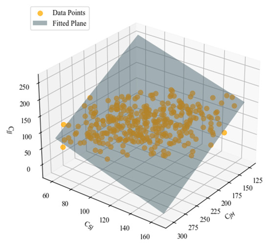 By fitting the scatter points with the least squares method, the plane of Equation (20) can be obtained, as shown in Figure 14. The relationship between the numbers of trains operating on these three paths is fundamentally linear. Different directions contribute similarly to the station’s capacity for handling arriving and departing trains, with no single line direction exhibiting a dominant advantage or capacity constraint.