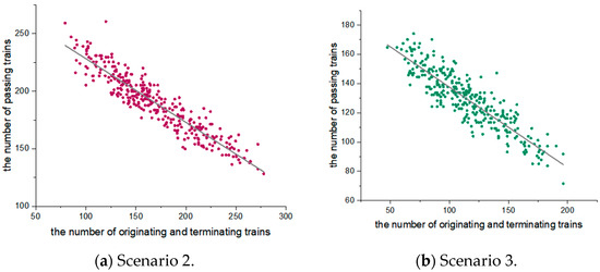 For Scenario 1, the number of originating, terminating, and passing trains within each station’s operational plan in the Pareto-optimal set is accounted for separately. As illustrated in Figure 15, a two-dimensional scatter plot is constructed from the data. This plot indicates that the maximum number of originating and terminating trains—as well as the number of passing trains that Jinanxi Railway Station can accommodate—exhibits a primarily linear correlation.