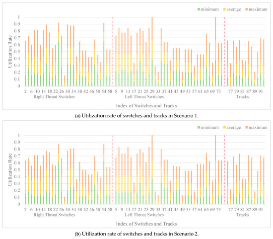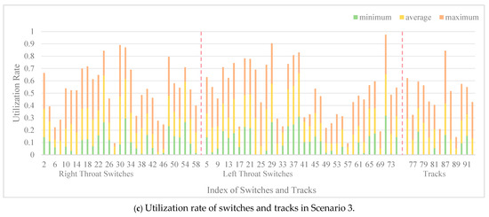 Further analysis of the data reveals that the impact of different transportation organization methods on capacity primarily depends on the limitations of certain key switches. The Pareto-optimal set is analyzed to determine the utilization rates of tracks and switches for each individual. The maximum, minimum, and average utilization rates for each track and switch across 330 individuals are calculated and presented in a bar chart in Figure 16. The dotted lines in the figure serve to delineate the boundaries of the switches and tracks within the right throat, left throat, and platform regions. In Scenario 1, the switch utilization rate is relatively high and balanced. This is primarily due to the operational requirements in Scenario 1, which demand a high frequency of train arrivals and departures, leading to the frequent occupation of all throat and platform tracks. Under the operational conditions in Scenarios 2 and 3, the train arrival intervals increase. While the key switches in the throat area remain occupied multiple times, the utilization frequency of other tracks and switches decreases. This results in a lower overall utilization rate of station resources, accompanied by greater variability in utilization. In all three scenarios, specific switches consistently operate at a higher capacity utilization rate. This also shows that the capacity limits of the key switches in the throat area impact the number of train arrivals and departures in different directions to varying degrees.