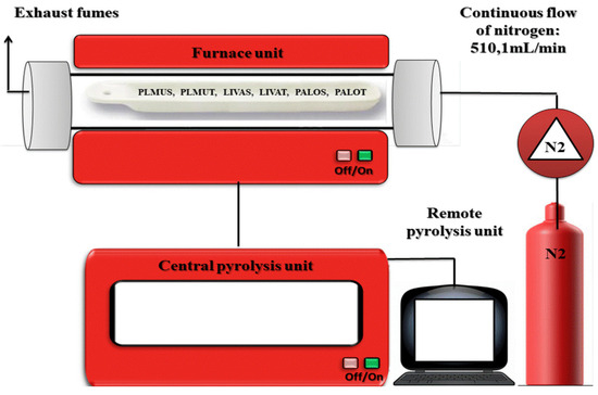 Commercially available shrimp of the species Pleoticus muellieri (PLMU), Litopeneus vanamei (LIVA), and Parapenaeus longirostris (PALO) were purchased from a local market on Lemnos Island in Myrina. The samples were separated into shells (PLMUS, LIVAS, PALOS) and tails (PLMUT, LIVAT, PALOT), then washed under running water, dried in the laboratory at 105 °C for 24 h, crushed in a laboratory blender, sieved up to 200 μm, and then stored in a shaded place at 20 °C. Each sample in powder form was placed in a ceramic crucible. The pyrolysis unit consists of the horizontal pyrolysis oven with a built-in quartz tube that forms the pyrolysis area, the central and remote unit, and the inert gas rheometer with a nitrogen gas cylinder. The ceramic crucibles were placed horizontally in the combustion chamber and the chamber was sealed. The nitrogen flow rate was equal to 520.1 mL/min as measured by the rheometer and inserted into the tube (Figure 1). Before the beginning of the thermal process, we inserted nitrogen gas for 10 min to remove the air from the chamber. The combustion program (PYROLOGISM 2.0 software) was set via the remote pyrolysis unit as detailed in Table 1. The PYROLOGISM 2.0 control and monitoring software helped continuously monitor the control temperature, the independent thermocouple (K type) inputs (typical accuracy ±0.2%), and the real-time graphical presentation of the executed program data. The thermal process lasted for 137 min. The samples remained at 850 °C for 30 min and then were physically cooled down by leaving them inside the furnace without heating to return to room temperature. The three-zone model of the reactor-type furnace RCT-AW1-O-1150 Thermansys, Thessaloniki, Greece, offers the best solution for many applications involving controlled atmosphere tubular reactors, heating up to 1100 °C. The nominal maximum power was equal to 5400 W. The carbonaceous materials were weighed before (W0) and after (W1) the carbonization process, and then stored in a shaded place at 20 °C. The percentage of weight loss can be calculated by the following equation: