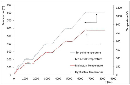 The recorded variation of temperature versus time in the three pyrolyzed zones is presented in Figure 2. The temperatures at which a thermostat has been set are observed in Figure 2. Three thermocouples measured the actual temperature at three zones (left, middle, and right side of the oven) versus time. The initial rate was 10 °C/min, while the program remained for 10 min at 200 °C, 400 °C, and 600 °C before the final temperature of 850 °C. According to Figure 2, the increase in temperature, as set by the thermostat, presents slow variations in the actual temperature measured by the thermocouples across the three different zones until 400 °C. At higher temperatures, there is an agreement between the theoretical and experimental temperature values, demonstrating excellent furnace performance until the end of the experiment at 850 °C. Consequently, all materials reached the desired temperature of 850 °C independently of their position. The choice of the final temperature (850 °C) and the remaining duration (30 min) in this temperature was the result of conducting other studies [21], and the fact that as mentioned in the introduction section, the integrated degradation of the lignocellulosic materials occurs between 800–900 °C.