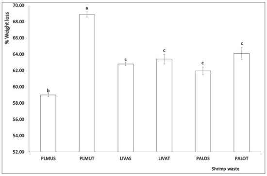 Weight loss percentage and Tukey’s post-hoc test of the shrimp after the carbonization process, where a,b,c the statistical letters provided to show the differences between the treatments.