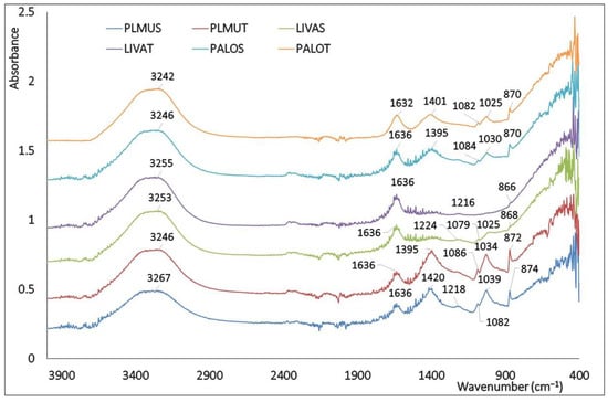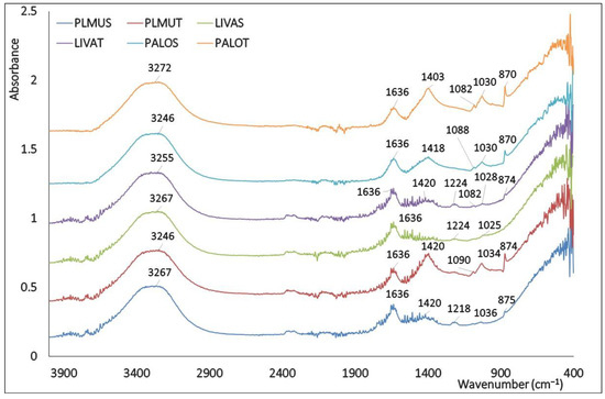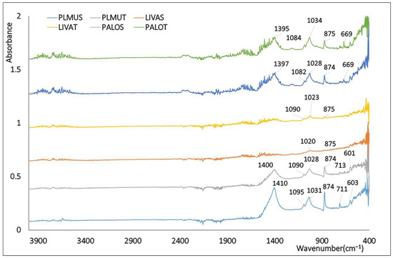 The FTIR analysis of the carbonized materials is shown in Figure 4. The shells and tails of the shrimp species pyrolyzed at 850 °C show absorption bands at 669 cm−1 and 601 cm−1, indicating the presence of C=O bending vibrations [32], while the absorption bands at 711 and 713 cm−1 indicate the presence of out-of-plane hydroxyl stretching vibrations [17]. In addition, the absorption bands at 875 cm−1 indicate the presence of glycosidic bond stretching, C-O-C [17], while the absorption bands from 1020 to 1035 cm−1, as well as from 1080 to 1090 cm−1 correspond to C-O, C-C, and carbon skeleton stretching vibrations, respectively [32,33,34]. The absorption bands at 1400 cm−1 were amplified due to CH deformations [17].