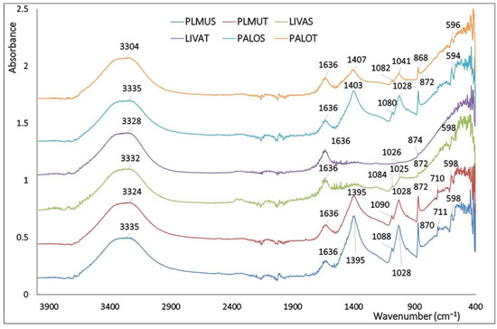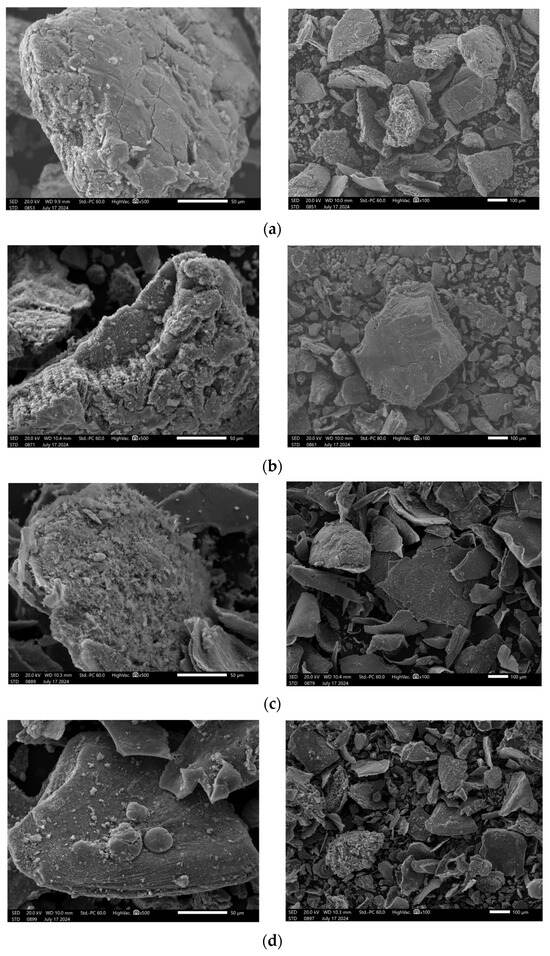 Scanning electron microscopy with EDS analysis was used to assess the six different materials (Figure 10). SEM images are included in two magnifications, i.e., 500× and 100× for the carbonaceous materials. The materials presented compact structures in the higher magnifications which are related to the surface texture and porosity. The materials PALOT, LIVAS, and PLMUT adopted a more sponge-like appearance, with some heterogeneity in the particle sizes.