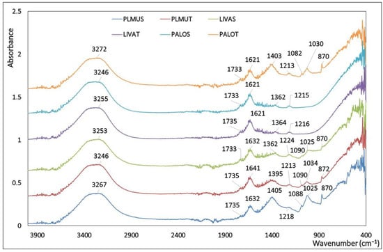 At the end of the pyrolysis process, the percentage weight losses of the six different shrimp samples PLMUS, PLMUT, LIVAS, LIVAT, PALOS, and PALOT were calculated, and the results are presented in Figure 3. The percentage weight loss increased significantly for all the materials in the following order: PLMUT by 68.90%, PALOT by 64.10%, LIVAT by 63.40%, LIVAS by 62.80%, PALOS by 62.00%, and PLMUS by 59.00%. According to the statistical analysis (Tukey’s post-hoc test), the tail of Pleoticus muelleri had the significantly highest weight loss, while the shell of Pleoticus muelleri had the lowest. All the other materials (LIVAS, LIVAT, PALOS, PALOT) did not present significant differences.