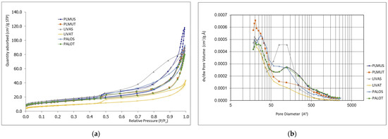 The basic characteristics of the pore structure of all adsorbents are outlined in Table 3. Comparing the specific surface area (Sbet) of the materials, it seems that the increase in the Sbet follows the order: LIVAS > PLMUS > PALOT > PALOS > PLMUT > LIVAT. Comparing the carbonaceous adsorbents of the same origin, it seems that the shells and tails of Parapenaeus longirostris (PALO) and Pleoticus muellieri (PLMU) present similar specific surface areas while the shells and tails of Litopeneus vanamei (LIVA) present different values of Sbet. Moreover, according to the adsorption average pore diameter values (daver.p.d., dBJH, aver.p.d), the PLMU shells and tails presented the highest diameter values while LIVA had the lowest. Furthermore, carbonaceous adsorbents derived from shells presented higher total pore volume compared to tails for all shrimp species. Table 3 shows that the minimum total pore volume occurred with the LIVAT materials, and the maximum total pore volume appeared in PLMUS.