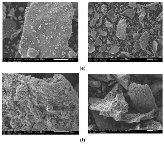 SEM images of the different shrimp species after the carbonization process in two magnifications, 500× and 100×, where different letters refer to the different species, e.g., (a) PLMUS, (b) PLMUT, (c) LIVAS, (d) LIVAT, (e) PALOS, and (f) PALOT (the first column is 500× and the second column is 100×).