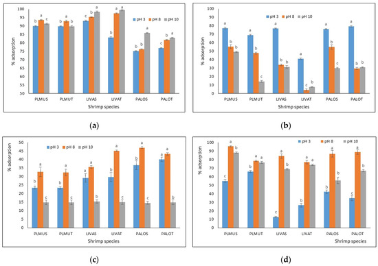 Adsorption percentage and Tukey’s post-hoc test for organic compounds ((a) MB, (b) MR, (c) phenol, and (d) astaxanthin) on carbonaceous materials at different pH values, where a,b,c the statistical letters provided to show the differences between the treatments.