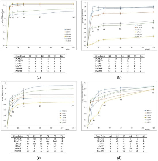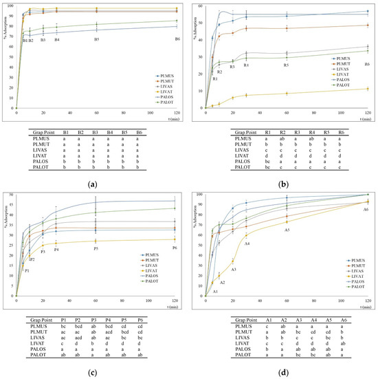Adsorbed amount and Tukey’s post-hoc test for the different compounds, i.e., (a) MB, (b) MR, (c) phenol, (d) astaxanthin per gram of adsorbent at an adsorbent to adsorbate ratio equal to 10/1 g/L, where Bi, i = 1 to 6, representing the points corresponding to MB, Ri, i = 1 to 6, representing the points corresponding to MR, Pi, i = 1 to 6, representing the points corresponding to phenol, and Ai, i = 1 to 6, representing the points associated with astaxanthin, a,b,c,d are the statistical letters provided to show the differences between the treatments.
