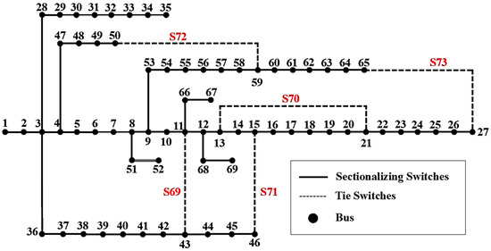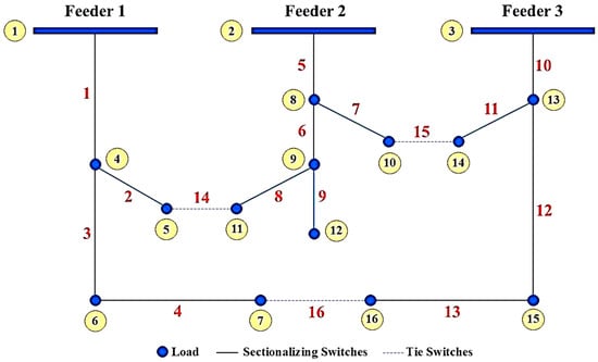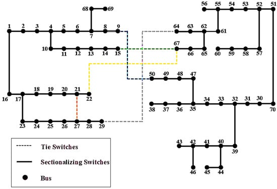 Dynamic reconfiguration accounts for variations in load and generation and is implemented over shorter timeframes, such as an hour, a day, or a week. This approach requires an advanced communication infrastructure and remote-control switches capable of frequent and quick operations, such as opening and closing. As a result, dynamic reconfiguration is typically limited to modern distribution networks equipped with such infrastructure. While dynamic network reconfiguration can account for time variations in load and generation, static reconfiguration assumes constant loads and generation at peak or average values [44]. In the distribution system shown in Figure 3, where multiple DG units are integrated, planning for the next 24 h requires accounting for the varying demand in each hour. Consequently, demand fluctuates throughout the day, and the network topology changes based on switch management. Additionally, the output of DG units is not constant but varies with the load each hour.