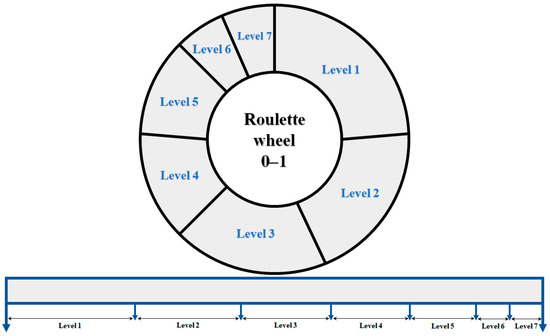 In the scenario generation method, similar to the Monte Carlo approach, random values are assigned to each uncertain parameter. As shown in Figure 5, the roulette wheel mechanism is then used to calculate the error rate and probability for each uncertainty source based on the generated random numbers. If the probability of a prediction error is higher, it occupies a larger segment of the roulette wheel. After the roulette wheel is formed, a random number between zero and one is generated and placed in one of the intervals, each corresponding to a different level of parameter prediction. This probability level is selected for the desired scenario. To generate each new scenario, the roulette wheel mechanism simulates the random behavior of the uncertain parameters. By combining the errors from each uncertainty source, the initial scenario is produced, and the overall probability of the scenario is calculated by multiplying the probabilities of the uncertainty parameters. This method generates different scenarios with their corresponding probabilities, which are then used to solve the problem [65,66].