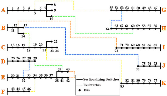 Distribution networks are typically operated in a radial configuration to reduce feeder short-circuit levels and simplify protection mechanisms. For faster recovery after faults, DNs—especially in urban areas—are built with meshed structures and include tie (normally open) switches. These switches reconnect customers to unaffected feeders during outages and transfer loads to other feeders as needed. In routine operations, DN operators may adjust configurations by closing normally open switches and opening the same number of normally closed switches to achieve specific operational objectives. Optimal configurations are also essential in DN planning studies to meet defined planning goals. Thus, DNR can generally be defined as a process of adjusting a DN’s configuration, using open and closed switches, to achieve targeted objectives [4]. Figure 1 shows a single-line layout of a network, in which the sectionalizing and tie switches are visible.