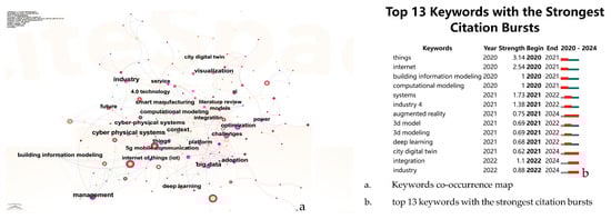 In order to sort out the research related to digital twin technology in smart city construction, the Web of Science search mainly covered core academic journal articles with the themes of “digital twin” and “smart city”, and a total of 2020–2024 245 articles published during the period. The keyword co-occurrence and occurrence analysis based on Citespace 6.3.R1 software is shown in Figure 2. The analysis results show that scholars’ related research mainly focuses on visualization, intelligent manufacturing, cyber–physical systems, big data, optimization platforms, management, and monitoring. Digital twin technology greatly improves operational efficiency, reduces costs, and drives innovation by enabling real-time data exchange between physical objects and digital models across multiple industries. For example, Li, G et al. applied a digital twin network (DTN) to smart city data sharing, which continuously supports the promotion of more efficient and secure data sharing in smart cities [48]. Ehab Shahat et al. utilized the urban digital twin development technology to improve data processing efficiency, enhance the integration of socio-economic components, and promote the intersection of the digital world and the physical world, which significantly improves the urban management level and residents’ quality of life [49]. Wang, W et al. introduced edge computing technology and deep learning algorithms to construct an intelligent traffic sensing system based on digital twins, which improved the accuracy of traffic scene recognition [9]. Huang, W optimized the energy internet planning platform through digital twin technology, which significantly reduced the investment cost in terms of integrated energy systems in smart city regions [50]. Lv, Z et al. demonstrated the importance of digital twin technology in enhancing urban perception, decision-making capability, and governance by analyzing the integration of technology architecture and meta-universe [51]. Wang, H et al. utilized the integration of digital twin technology based on a deep learning intrusion detection system to increase the security of smart grid control systems for smart cities [23]. These specific practical application aspects reflect the significance and value of digital twin technology in the construction of smart cities.