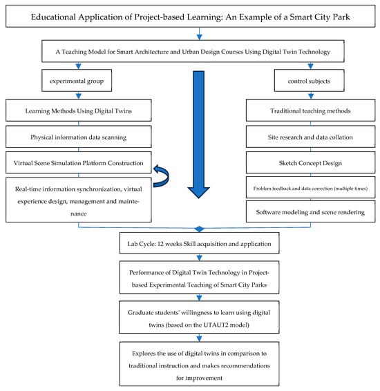 Currently, there is a relative lack of research on digital twin technology in engineering education practices in smart city parks. Through bibliometric analysis, the research on the application of digital twin technology in education and engineering practice mainly focuses on the optimization of teaching and learning environments and case studies. For example, Chen, SY et al. improved the quantitative assessment of teaching and optimized the teaching environment by constructing a teacher competency evaluation model based on machine learning and digital twin technology [36]. Opoku, DJ et al. provided a flexible and intuitive experimental environment based on Rapid Control Prototyping (RCP) technology for a robotic digital twin experimental platform to support learners to engage in real-time validation with complex control strategies [37]. Opoku, DJ et al. demonstrated a real-time data capture and visualization platform to optimize facility management through real-time digital twin modeling in a university library [38]. Improvements in space reservation, real-time sensor data, and asset management were achieved through the practical application of a BIM-based intelligent management platform on campus [39]. However, most of the existing research focuses on the improvement of the actual use environment and neglects the assessment of users’ experience, intention, and learning effect of using the technology. To fill this gap, this study adopts an empirical research approach to explore the application of digital twin technology in engineering education by relying on teaching courses and experimental platforms, comprehensively assessing learners’ and educators’ intention to take action, and combining practical teaching pathways with project-based courses. Meanwhile, project-based learning (PBL) focuses on students’ active learning practices and promotes the application and deep understanding of knowledge by solving open-ended problems in the real world [40]. In a project-based learning environment, students are able to effectively demonstrate rational decision-making processes and rational evaluation of teaching and learning outcomes [41].