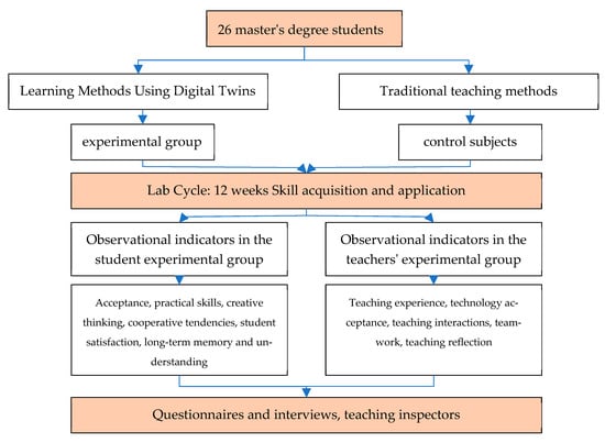Digital twins effectively support digital industrial transformation for industry 4.0 applications [1]. Digital twins have received attention from experts and scholars as an innovative paradigm and implementation technology for industrial environments [2]. This has led to an increase in the demand for such skills in society in the future. The shift from traditional to smart built environments requires the adoption of digital technologies to enable technological change [3]. The establishment and career orientation of design education is based on a shift in thinking towards design-driven and craft practice [4]. Currently, although traditional teaching methods still have a rich practical basis, under the influence of the Internet and communication technology, new teaching methods can effectively improve students’ academic performance, learning efficiency, and creativity compared with traditional teaching methods [5]. The pedagogical application of digital technology in education not only improves teaching efficiency, but also provides more learning opportunities for students [6]. However, significant technological innovations are needed to drive socio-economic progress through education, welfare, and training programs [7]. Digital twin technology has a wide range of application areas, such as improving the performance of energy storage and reducing maintenance and operational costs [8], constructing dynamic scenarios of wetlands for ecological preservation [9], developing digital twin models of ports in conjunction with artificial neural networks [10], and facilitating the development of smart cities and planning decisions [11]. Existing studies have shown that digital twins hold great potential for smart manufacturing, such as for energy simulation optimization of heated tunnels to reduce energy consumption and costs, and have become a key technology for the driven digital information age [12,13]. In terms of human–computer interaction, the technology can be used to remotely operate vehicles and identify critical problems through augmented reality [14], to build virtual simulations and interactive learning to solve distance education problems [15], and to build virtual and remote laboratories to create authentic learning environments [16]. Digital twins can be advantageous in terms of cost-effectiveness, resource management, and immersive learning experiences [17]. The application of these technologies supports the demand for developing top innovators and applied talents in relevant engineering and technology fields.