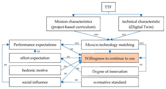 Task characteristics (TAF) refers to the degree of match between practice needs and task characteristics, and the task characteristics of project-based course practice will significantly affect the degree of technical match of graduate students’ adoption of digital twin technology, which is assumed to be H10. Technology characteristics (TEF) refers to the degree of match between technology characteristics and practice task needs, and the digital twin technology characteristics will significantly affect the degree of technical match of graduate students’ use of carrying out the project-based course practice. The task technology matching degree (TTF) of graduate students using digital twin technology to carry out project-based course practice significantly affects their willingness to continue to use it and performance expectations, and it is hypothesized that it is H12 and H13. In summary, the research model is shown in Figure 5 below.
