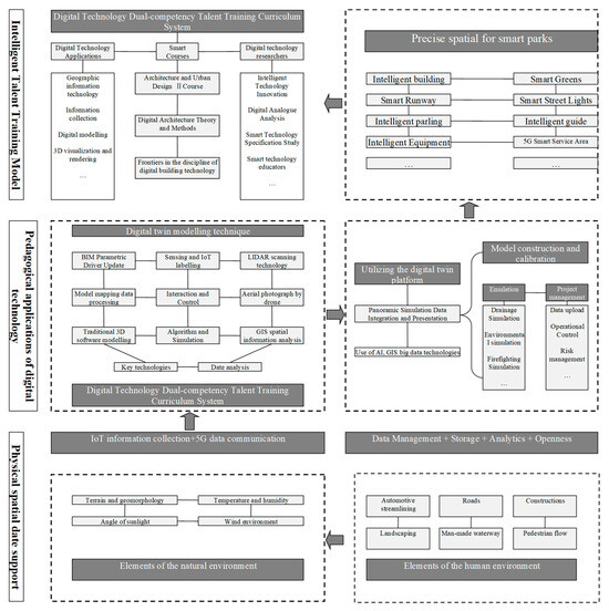Increasing urbanization and increased population density in cities lead to high demand for natural resources and ecosystem services [18]. Smart cities are regarded as an ideal solution for the digital development of cities to address resource scarcity, environmental pressures, and governance issues [19]. The development of smart city construction faces significant challenges from digital transformation, including the adoption of new technologies in multiple fields such as energy management, ICT, Internet of Things (IoT), big data, smart transportation, and urban governance [20,21,22]. Digital twin technology is also widely used in smart city construction, such as digital twin energy internet planning platforms [23], smart city stormwater infrastructure drainage systems [24], smart city power systems (including transportation system, smart grid and microgrid) [25], and underground smart parking lot environmental monitoring systems [26]. The digital twin technology concept is an important foundation for smart city construction and the coordinated development of energy systems and cities [23], and this technology concept requires engineering firms to optimize their technical processes and improve the comprehensive capabilities of their management and personnel in order to adapt to new demands. In fact, compared with the above basic requirements of smart city construction for talent cultivation, the derailment between universities and enterprises has led to the existing engineering education system being unable to meet basic talent delivery. Therefore, colleges and universities can utilize digital twin technology to carry out the teaching reform of engineering education courses in the context of smart city talent demand, combining with practice to enhance students’ application ability and knowledge level, including the application of teaching practice in the smart city park, in order to improve students’ employment channels.