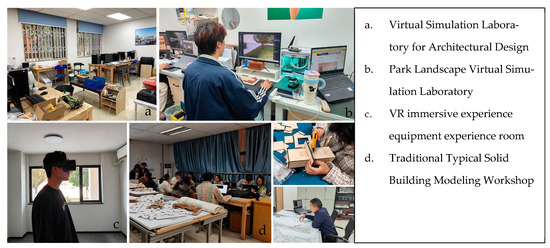 Smart Building and Urban Design is an important core course in the teaching practice of the program curriculum. On the one hand, the course helps students gain a deeper understanding of the state of the physical environment by simulating real-world smart buildings and conservation projects in a digital twin environment for real-time monitoring and adjustment; this provides the conditions for students to try out a wide range of landscape solutions, which in turn enhances their practical functions. On the other hand, using the high flexibility and interactivity of the digital twin platform, students are taught how to analyze the data collected in the digital twin model to optimize the design and maintenance strategies of the smart city park, improve their ability to solve practical problems, and stimulate their design creativity and innovative thinking, so that they are able to design smart, sturdy, practical, and aesthetically-pleasing smart city park buildings and landscapes in a single place space. By utilizing the virtual simulation laboratory of architectural design, the image processing laboratory of landscape design, the VR immersive experience equipment experience room, and the traditional typical entity building model building studio, as shown in Figure 7, they can realize the real, real-time, and virtual mapping of the architectural design and construction of the landscape of the smart city park and experience the virtual scene perception and conceptualization of the program analysis, so as to assist in the realization of the virtual wisdom-based park architecture landscape scene of experiential teaching.